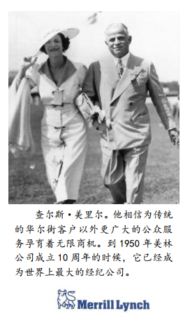 美里尔的成功很自然地迫使其他华尔街经纪公司也群起仿效他的业务模式,那种陈旧的、小作坊式的经纪公司开始走向衰亡,全国性的经纪公司迅速崛起。在很大程度上,查尔斯·美里尔可以说是现代经纪业的鼻祖,他在华尔街经纪人中的重要地位毫不逊色于J·P·摩根在银行业所拥有的地位。
