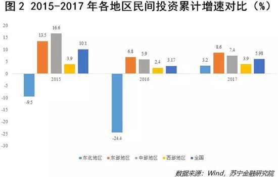 国家统计局发布的数据显示,2015~2017年,东北的民间投资累计增速始终为全国四大区域板块中表现最差的,2015年与2016年更是全国唯一的民间投资负增长地区,增速分别为-9.5%和-24.4%(参见图2)。