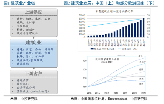 建筑业主要包括房屋建筑、土木工程、基础设施等(见图1),在经济中的地位举足轻重。建筑业的增加值在发达国家占GDP约5%、在发展中国家占GDP约8%,全球年收入将从约10万亿美元增长至2025年15万亿美元。欧美发达国家的存量市场之外,发展中国家的城镇化进程仍在持续,继中国数十年的稳步增长(见图2),印度、越南等国城镇化将为建筑业增长注入新的动能。另一方面,建筑业对就业贡献显著,全球提供超过1亿个岗位,其中在中国提供五千多万个[1]。