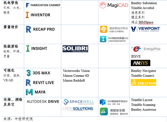BIM从行业划分上主要属于建筑类应用软件业,按对应的专业需求可细分为制图、建模、结构、机电、暖通、算量、造价、能耗、环境、可视化、测绘、运维等诸多类型(典型产品见表1)。其中,最核心的是CAD制图和建模软件,最能反映管理协作特点的软件为BIM集成与项目管理类软件。Autodesk等国际领先的BIM公司产品线齐全,不但包括各种专业应用,往往还提供BIM集成套装作为完整的解决方案;另一方面,需求多样性也为后来者提供了一席之地,国内BIM公司通过深耕一些细分专业并辅以本地化优势,在国内市场占据了一定份额。此外,BIM咨询和培训也有一定发展。