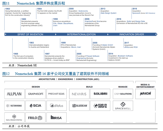 德国Nemetschek集团是欧洲最大的建筑软件公司,通过多次并购(见图11)囊括了16家子公司(见图12),形成了以BIM为导向的较完整建筑软件产品体系,这些子公司均为年收入5百万至1亿欧元的中小企业,也是Nemetschek集团引以为豪并按照“隐形冠军”发展的策略。总部位于慕尼黑的Nemetschek集团全球用户超过500万,2018年营收增长至4.6亿欧元,主要来源为欧洲(占60%)。美洲成为最大的营收增长引擎,从2013年占比11%增长至2018年占比32%。该集团下一步将更多向基建领域渗透。