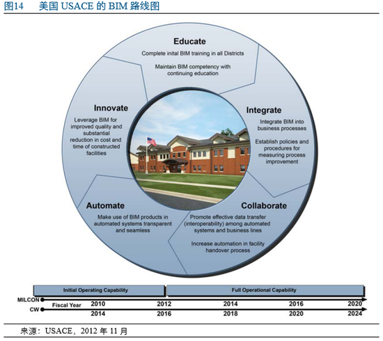美国建筑业以自下而上、市场驱动的方式推动BIM行业发展。实践中,由Autodesk、Bentley等世界一流BIM软件公司以及建筑师协会、总承包商协会等行业协会主导推动,形成了内容丰富的多种标准规范。2002年Autodesk抛出BIM现代化解决方案,通过数据库促进建筑信息共享和协作。次年,美国总务局(GSA)推出国家3D-4D-BIM计划并发布指导手册,要求2007年大型项目必须应用BIM。同时负责军用和民用建筑项目的美国陆军工程兵团(USACE)在2012年第二版BIM路线图中,将民用BIM路线独立出来并较军用推迟4年(见图14),还指出并非所有项目都必须应用BIM。尽管美国国家BIM标准已更新至第三版(NBIMS-US v3),但联邦层面的政策引导或强制性约束总体上比较少;地方政府层面,威斯康辛州等推出的BIM指导意见或强制要求也在一定程度上促进了行业发展。