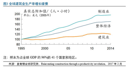 长期以来,建筑业的生产率增长缓慢,明显低于整体经济,更远低于同为第二产业的制造业(见图3)。不同地区建筑标准规范的差异性导致了建筑业本地化,建筑项目的定制化要求导致建筑业碎片化,承包商和客户的风险厌恶倾向以及劳动密集型特点使得建筑业对技术创新相对迟钝。
