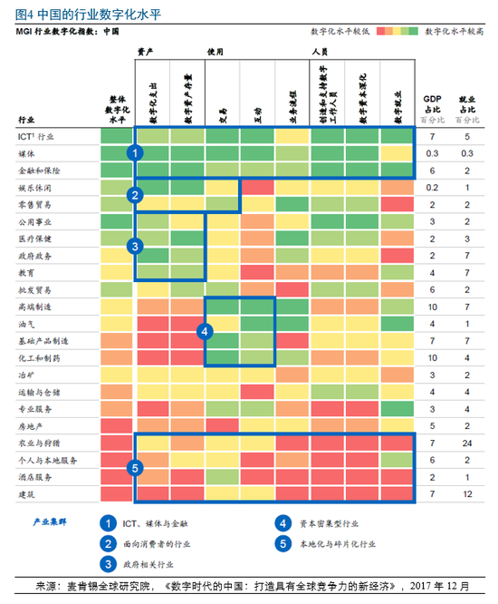 为了更好地解决超支、逾期、节能及生产率低下等问题,建筑业比较明显的发展方向包括装配式建筑、机器人、新型建筑材料、数字化等。数字化有助于改善进度和预算管理,2016年至2025年间全面数字化可为全球非住宅建筑业减少23%~38%成本。[2]与同样具有本地化和碎片化特征的其它传统行业类似,建筑业的数字化步伐相对缓慢(见图4),但随着政策出台、标准制定和行业共识深化,建筑业的数字化转型有望提速。