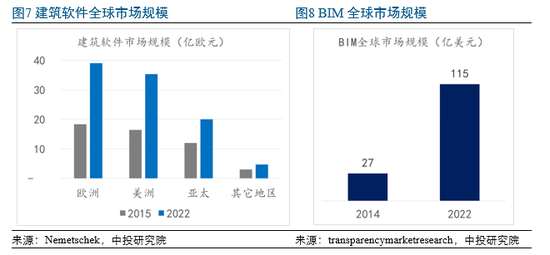 全球建筑软件市场规模预计从2015年48亿欧元增长至2021年99亿欧元,年复合增长率11%,其中欧美合计占全球市场规模约四分之三,而亚太地区增速略逊(见图7)。具体到BIM市场,其全球规模将从2014年27亿美元增长至2022年115亿美元,年复合增长率19.1%(见图8)。