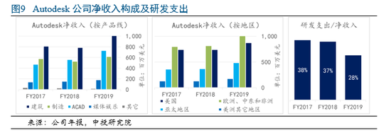 美国Autodesk公司基于其全球CAD软件龙头优势建立了以BIM建筑软件产品体系。核心产品AutoCAD和AutoCAD LT(以下合称ACAD)在2019财年占该公司净收入的28%(如果计入包含有这两项产品的套件这个比例会更高),Autodesk的销售战略是将其它产品和服务推向核心产品客户。Autodesk一方面不吝于研发投入以维持技术优势,另一方面通过收购Assemble Systems、PlanGrid、BuildingConnected等公司扩充实力,其建筑业软件产品线是公司最大的净收入来源,占全部净收入40%左右(见图9)。近年,Autodesk公司加速云计算转型,商业模式从传统的销售许可转换到订阅服务,2019财年来自订阅计划的经常性收入同比增长87%,云转型的成功将进一步巩固该公司的建筑和制造行业软件领袖地位。