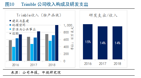 美国Trimble公司(天宝公司)以GPS、激光及惯性导航定位技术为根基,为多个行业提供解决方案,在建筑建模、管理和测绘定位等方面具备一定优势。继2016年从谷歌收购三维建模软件公司Sketchup后,不断加码建筑业务,2018年分别以12.11亿美元、4.86亿美元收购了建筑管理软件公司Viewpoint和e-Builder,目前建筑与基建成为该公司第一大收入来源(见图10),北美和欧洲合计占公司超过80%的收入。