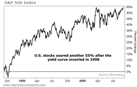 图注:1998年9月,债券收益率倒挂之后,标普500指数涨幅达到55%。
