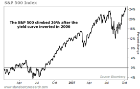 上一次出现债券收益率倒挂是在2006年1月,当时也引发了市场对经济萧条和股市下跌的极大担忧。这些恐惧最后被证实也是对的(但对于那些做了反向操作获得收益的投资者则除外。),