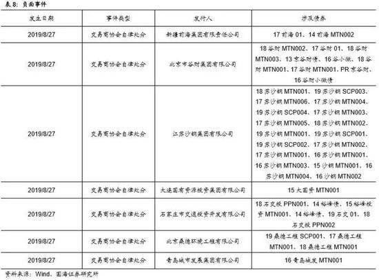 本期负面事件有,新疆前海集团有限责任公司交易商协会自律处分、北京市谷财集团有限公司交易商协会自律处分、江苏沙钢集团有限公司交易商协会自律处分、大连国有资源投资集团有限公司交易商协会自律处分、石家庄市交通投资开发有限公司交易商协会自律处分、北京桑德环境工程有限公司交易商协会自律处分、青岛城市发展集团有限公司交易商协会自律处分、中国民生投资股份有限公司未按时兑付本息。