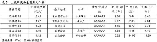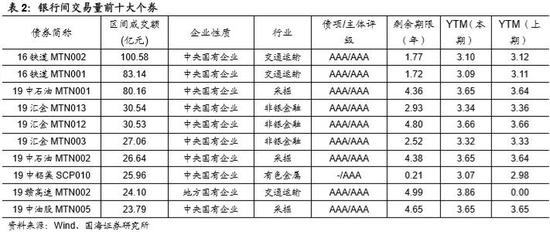 上周银行间成交最活跃的个券是16铁道MTN002、16铁道MTN001、19中石油MTN001、19汇金MTN013、19汇金MTN012、19汇金MTN003、19中石油MTN002、19中铝集SCP010、19赣高速MTN002、19中油股MTN005,银行间市场交通运输、非银金融和采掘行业比较热门。上交所最活跃的个券前五位则是16福新01、16穗建05、18神州01、16万达02、17渝信01,深交所则是16榕建01、19同煤04、18太国债、17华源01、16东集04,交易所是房地产行业受到较多关注。