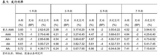本周3年期中票收益率有所分化,5年期各等级中票收益率有所回升。3年期AAA、AA+、AA中票收益率分别变动-0.95BP、0.05BP、-0.04BP至3.40%、3.57%和3.92%;5年期AAA、AA+、AA中票收益率分别变动2.40BP、4.40BP、4.40BP至3.73%、3.96%、4.53%。