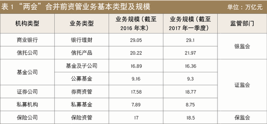 截至目前,资管业务尚未在法律和规制层面具备清晰的定义,而主要指银行、保险、信托、证券、基金等金融机构接受客户委托,根据合同约定,对客户财产及其权利进行管理和处分,使客户获得收益并承担风险,金融机构相应获得报酬的各类金融业务。按照以上定义,资管业务大致可分为五类:一是银行理财,主要由居民储蓄转化而来,是资管市场上游资金的主要来源;二是信托产品,主要包括集合信托和单一信托;三是券商资管,主要包括集合资管计划和定向资管计划;四是基金及子公司,主要包括公募基金、基金公司及其子公司专户、私募基金;五是保险资管,主要受托管理母公司及第三方资金。截至2017年一季度末,各类资管业务规模为122.75万亿 (见表1)。其中,信托资产余额21.97亿,占比17.90%。剔除交叉持有和嵌套因素20万亿〜30万亿,资管业务总体规模为90万亿〜100万亿。