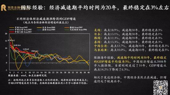 从美国、日本、韩国、泰国、中国台湾、马来西亚等国家或地区的发展历程来看,全球经济减速期平均时间为20年,最终稳定在3%左右。如果说中国经济增速从2008年步入换挡期,目前刚刚走过了10年,GDP增速从高点14.2%下降到了6.3%,也就是说,还有至少10年左右的减速期。