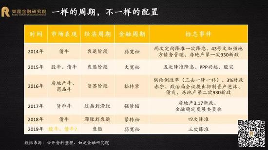 从2014年到2018年,中国经济经历了一轮完整的经济周期和金融周期,资产表现也呈现明显的轮动规律,每年都有一两个资产处在牛市当中,如2014年的债市,2015年的股市,2016年的楼市,2017年的货币,2018年的债市。