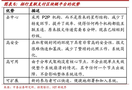 积极参与外部区块链项目。1、粵港澳大湾区贸易金融区块链平台。在中国人民银行数字货币研究所与中国人民银行深圳市中心支行的共同推动、协调和组织下,深圳金融科技研究院联合中国银行、建设银行、招商银行、平安银行、渣打银行及比亚迪共同开发的基于区块链技术的贸易金融底层平台,旨在有效促进市场信任机制的形成。作为该平台的核心参与行之一,招商银行主动参与平台和应用场景的设计与开发,仅用时3个月便成功实现首笔业务放款落地。2018年10月,招商银行成功通过粵港澳大湾区贸易金融区块链平台,为战略合作伙伴投放首单应收账款融资业务。在该笔应收账款融资业务中,核心企业付款明细签发、供应商融资申请以及银行受理等全程均通过该平台完成,大大降低了银行在客户调查和验真方面的成本,加速了中小企业融资效率。2、基于区块链的产业互联网协作平台。由招商银行与中建发展所属的中建电商在2018年11月联手打造的去中心化的供应链金融反向保理系统。据中建发展提供的资料显示,该系统基于Hyperledger Fabric V1.1联盟链,实现了采购各环节交易数据实时写入由核心企业、金融机构共同维护的分布式账本,实现每笔交易可追溯,杜绝交易数据被修改,提升数据可信度。中建产业互联网协作平台通过预先导入所有有效融资业务数据,实现供应链数据有据可循,从招标任务到中标通知、合同、订单/产值单、应收账款闭环查询,保证数据真实性。平台支持中建电商和招商银行实时跟进融资进度,打通信用流转,促进资产盘活,保证业务顺利开展。