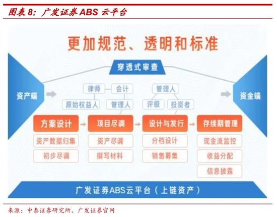 自主研发基于区块链资产证券化平台:广发ABS云平台。为解决传统资产证券化市场的信息不对称、发行管理困难、资产运行效率低等核心痛点,广发证券自主开发ABS云平台,旨在提高效率降低成本的同时协助管理人履行好责任与义务,更好地服务客户,打造广发资产证券化品牌。应用区块链技术对业务流程中产生的资金和业务变化进行有效数据传输和风险监控,同时也保证了数据的真实性和不可修改,广发证券ABS云平台采用了“小步快跑,快速迭代”的方式进行分期开发,2018年第一期主要包括了数据收集和区块链存证的功能,2018年10月18日平台实现首笔基础资产上链保存—广发资管担任管理人的“广发恒进-正佳企业集团正佳广场资产支持专项计划”,该计划基于广发证券ABS云平台进行管理。