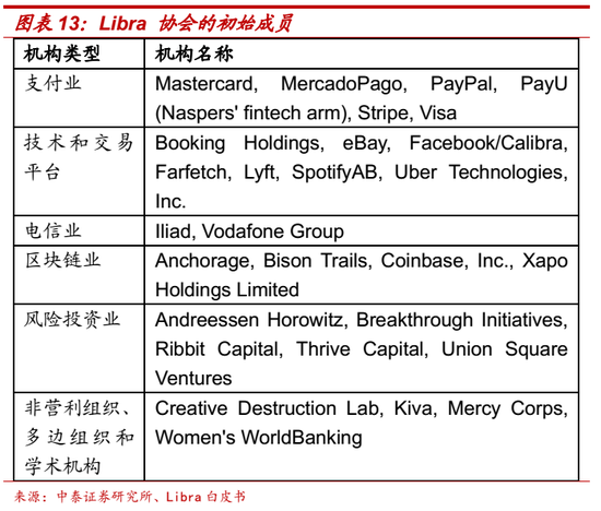 联盟链。Libra 协会是一个独立的非营利性成员制组织,总部设在瑞士日内瓦。协会负责协调和提供网络与资产储备的管理框架,并具有最终决策权。Libra 协会的成员将包括分布在不同地理区域的各种企业、非营利组织、多边组织和学术机构。预计到2020年上半年数字货币推出时,Libra 协会的创始人数量能够达到 100 个左右。Facebook领导了Libra 协会和Libra区块链的创建,在Libra正式推出之前继续保持领导地位。在数字货币上线之后,Facebook不再具有特权,而是与协会中的其他成员具有相同的权利,共同管理Libra数字货币体系。