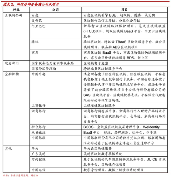 网信办备案项目超过500家。国家互联网信息办公室(网信办)于今年3月和10月分别发布了两批区块链备案项目。第一批备案共197家,来自18个省市,数量排名靠前的分别为北京63家、广东47家、浙江25家、上海19家、江苏12家。第二批共309家,来自18个省市,前五位排名与上一批相同,备案数量分别为87个、72个、53个、35个、14个。主体单位主要包括互联网巨头及其旗下公司、金融机构、事业单位、上市公司等。项目内容包括区块链技术平台及应用服务,包括溯源、确权、防伪及供应链金融等。
