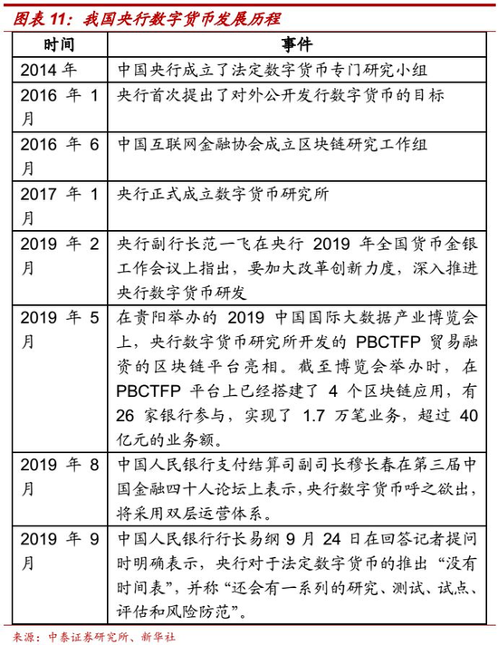 我国央行数字货币发展过程。我国是最早研究央行数字货币的国家之一,2014年,时任央行行长的周小川便提出构建数字货币的想法,央行也成立了全球最早从事法定数字货币研发的官方机构——央行数字货币研究所。该所主要工作职责是根据国家战略部署和央行整体工作安排,专注于数字货币与金融科技创新发展,开展法定数字货币研发工作。今年9月,央行支付结算司原副司长穆长春正式出任央行数字货币研究所所长。Facebook发布Libra数字货币白皮书之后,央行开始密集发声。穆长春也多次针对Libra和央行数字货币发表公开评论。在第三届中国金融四十人论坛上,穆长春首度公布央行数字货将采用“双层运营体系”,同时宣称央行数字货币已经“呼之欲出”。中国人民银行行长易纲9月24日在回答记者提问时明确表示,央行对于法定数字货币的推出“没有时间表”,并称“还会有一系列的研究、测试、试点、评估和风险防范”。