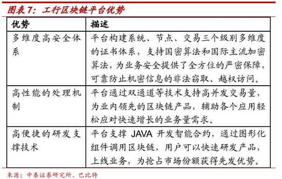 主要从技术水平和应用情况来评估金融机构的区块链技术。1、技术能力。大部分金融机构在区块链上有所布局,但在金融科技投入中的占比不高。由于目前区块链技术仍处于发展早期,尚未权威的技术评定标准,主要可参考申请专利数量、网信办备案数量等指标。技术能力主要表现在系统性能和加密算法上。2、项目的规模及开放程度。区块链技术主要解决的开放系统中节点和节点的信任问题,加入的节点越多,平台的价值越大,尤其是外部节点,包括企业、政府部门、其他金融机构等,参与节点越丰富,平台能实现的功能越多。3、应用场景。金融服务的模式正在转变,从以产品为中心向以客户中心升级,金融与行业的融合程度不断增强,区块链平台要与客户需求结合,基于具体场景进行系统开发。丰富的场景应用也有利于技术的持续迭代。