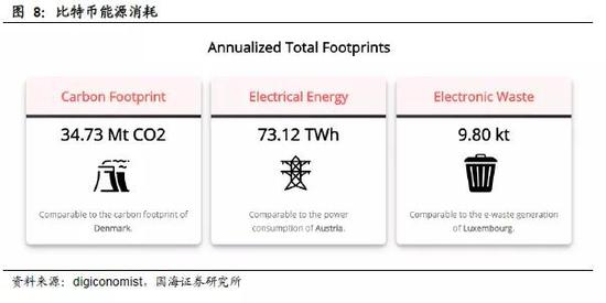 3)资源浪费:计算机计算密码谜题需要大量的算力,需要高性能的计算机设备、消耗大量电力等资源。根据digiconomist的评估,比特币2018年度排放的二氧化碳达34.73百万吨,相当于丹麦的碳排放量;耗电量达73.12兆千瓦时,相当于奥地利的耗电量;产生电子废物9.8克拉,相当于卢森堡产生的电子废物。