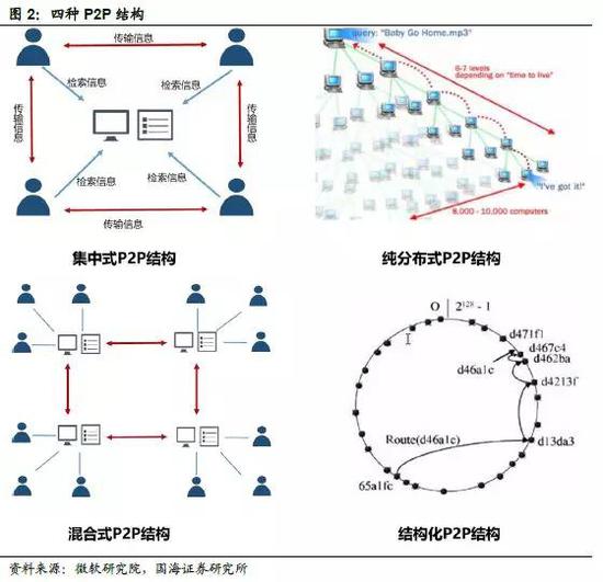 根据网络中不同节点之间如何建立连接通道,P2P存在四种不同的模式,不同的区块链应用可能采用不同的模式,具体分为:集中式、纯分布式、混合式、结构化模式。