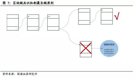 整条区块链的共识遵循最长链原则,只有最长链上的交易能够得到确认,也就是包含的工作量最大的那条区块链。“分叉链”不可持续,在下一次区块竞争时,每个节点会选择在某条分叉链上进行下一次记账权的竞争,由于存在巨大的工作量证明,同一时间内两个节点同时挖出区块的概率将呈指数级下降,因此,很快就会有“最长链”出现,最长链上的交易将获得确认,同时,较短链上的交易信息也会随之释放,重新标记为“未确认”,打包在下一个区块中。