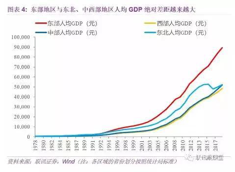 第二,尽管各区域的人均GDP相对差距有所缩小,但绝对差距仍然在持续扩大。2000年东部与西部的人均GDP差距约为7000元/人,2018年扩大到了超过4万元/人。