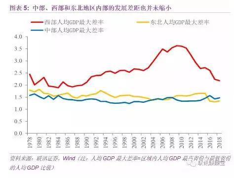 第三,区域内部各省间的发展差距也并没有缩小。我们将人均GDP差率,定义为区域内人均GDP最高省份与最低省份的人均GDP之比,来衡量区域内部的发展差距。可以发现,1978年到2018年中部、西部、东北地区的人均GDP差率都并没有明显收窄,其中西部在2002年到2009年,还从2.6上升到3.6。