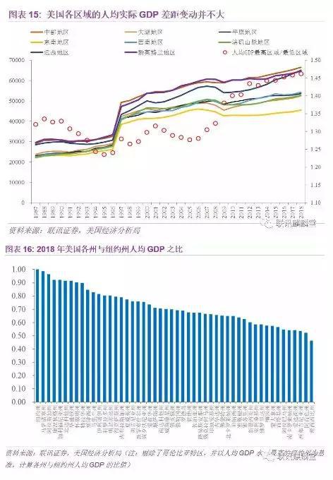 从美国各大区域的数据来看,人均GDP分化并不算严重。尽管2008年金融危机加重了美国的区域差距,但2018年美国人均GDP最高区域(中部地区)/最低区域(东南地区)的人均GDP比值仍然在1.5以下。