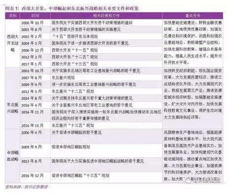 从表中可以看出,三大区域战略有一些相同的举措。首先是都强调要加强基础设施建设,包括交通、能源等。其次是通过财税和金融政策倾斜,给予这些地区资金支持。最后,三大战略中都提到了加快发展教育事业和引进人才、提高区域开放水平、优化调整产业结构、推进生态建设和环境保护事业等方面的内容。