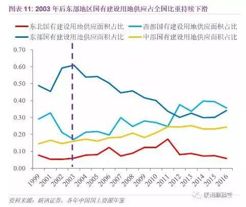 其次是土地资源的错配。在中国政府垄断了土地一级市场,并对建设用地供给实行严格的计划性管制,农村用地转换为城市建设用地面临相应的指标限制。2003年后更多的建设用地指标向中西部和东北地区倾斜,东部地区土地供应反而在收紧。从2003年到2014年,中部、西部、东北三大地区国有建设用地供应占全国比重从39%大幅提升至70%,东部占比则从61%持续下滑到30%。