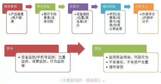 大数据风控不仅仅指信用评分、反欺诈等贷前审查环节,而是一套流程体系,涵盖从用户入口端的精准营销到贷后回款或催收管理的全流程。