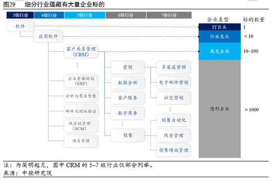 行业层次深度在较大程度上决定投资标的搜寻范围和数量。以标普GICS四级行业分类体系为例,CRM属于“信息技术→软件与服务→软件→应用软件”。很多情况下,宏观研究和资产配置可止步于一、二级行业分类,产业政策制定和公开市场投资可立足于更细分的三、四级分类,但非公开市场的投资并购往往还需要继续深入到更细分的行业层次。