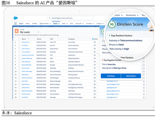 人工智能不但改善客户服务,也有助于商业流程自动化和销售线索管理。 Salesforce宣称其AI产品“爱因斯坦”可以对营销效果、线索转化和用户行为进行预测(见图36),并帮助销售人员摆脱录入数据的负担而聚焦到业务本身。Oracle等其他行业龙头及一些初创企业也推出了相关产品或功能。