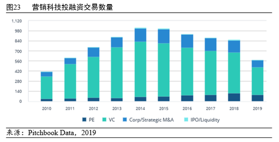 据不完全统计,全球CRM企业约2600家[9],定义更宽泛的营销科技公司则多达近7000家且主要分布在北美和欧洲地区,近年来行业的VC、PE、战略并购及IPO等投融资交易活跃(见图23)。