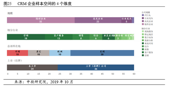 本文选取60家CRM企业为样本空间,从规模、细分行业、总部所在地、上市情况等不同维度看都有较好的代表性(见图25)。