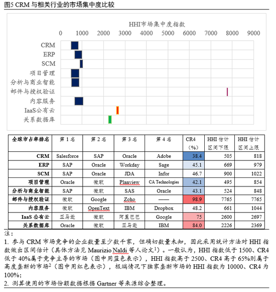 从全球市场集中度看,CRM行业属于竞争主导的市场。Salesforce继续遥遥领先,占CRM行业近20%的全球市场份额,几乎相当于Oracle、SAP、微软、Adobe等4家公司的份额之和,但从整个市场看,CRM行业前4大企业的市场占有率(CR4)不超过40%,HHI集中度指数不超过900。从相关软件行业集中度横向对比来看(见图5),除了邮件与授权验证行业存在寡头垄断(CR4、HHI两项指标分别高达98.9%、7765),CRM、ERP、SCM等其它企业应用软件行业的集中度都不高,而与CRM有一定联系的IaaS公有云、关系数据库管理系统(以下简称关系数据库)存在中度和高度垄断。再考虑到CRM行业较多的企业数量,我们认为总体上CRM市场结构良好,不存在明显垄断,尽管个别龙头企业在有的细分市场具备相当的定价权。