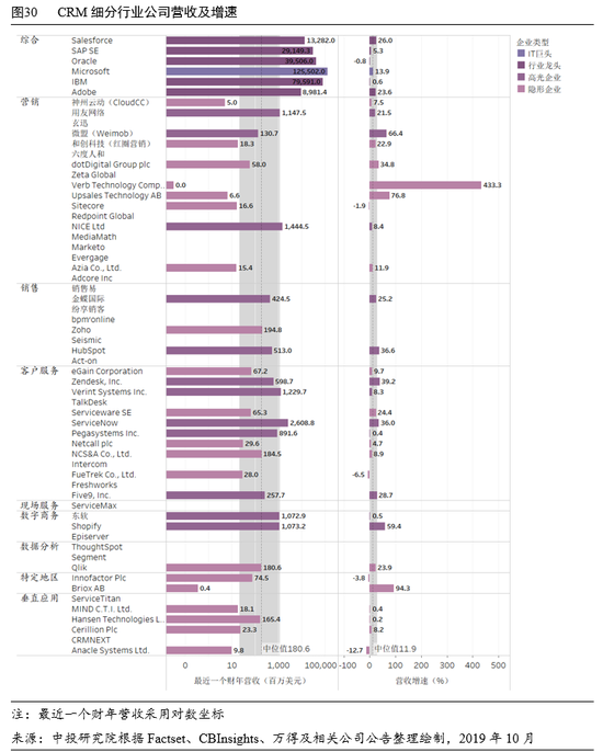 营销、销售、客户服务是企业采购CRM系统的传统核心述求,因此相应的CRM企业数量最多(见图30),大型CRM厂商提供的综合解决方案至少会覆盖这三个领域,而中小CRM厂商则可能聚焦某些细分行业以提供差异化服务。整体上,CRM公司最近一个财年的营收中位值为1.8亿美元,增速中位值达11.9%,反映了行业的存量和增量红利。必须指出,绝大多数CRM企业的产品服务都会涉及CRM的多个细分领域,这里参考其主要业务之一作粗略划分。