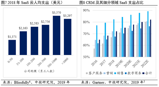 二是CRM云转型更快更成功。SaaS云已得到市场认可,从中小企业客户到大企业客户都在增加相关支出,人均支出创新高(见图7)。CRM占企业应用软件SaaS市场约半数份额,为高速增长奠定了基础(见图4)。2019年SaaS云支出将占到CRM总支出约75%,具体到销售、营销、客户服务、数字商务等4个细分领域,SaaS占比达70%~85%不等并且有望继续保持每年2到4个百分点的增速(见图8)。