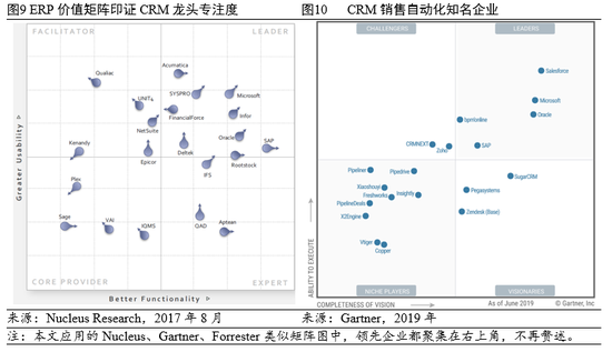 财富全球上市公司2000强中[6],进入前500的软件公司只有4家:微软(第16)、Oracle(第92)、SAP(第176)和Salesforce(第446),再算上紧随其后的Adobe(第505),这5家公司也正好是企业应用软件龙头,但其中只有Salesforce是专注于企业应用的客户关系管理领域。回顾历史不难理解,从成立时间看作为“70后”的微软、Oracle、SAP和“80后”Adobe都较早进入了企业应用软件市场并以ERP为重点(见图9),作为后起之秀的Salesforce聚焦到CRM市场无疑是明智之举,在销售自动化、套件和数据管理平台等多个CRM关键细分行业全球领先(见图10、图15、图20及图32)。