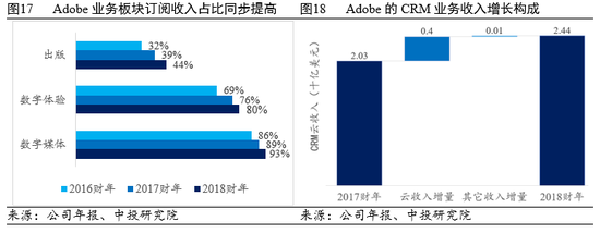 Adobe拥有数字创意(占公司总收入70%)、数字体验(27%)、出版(3%)三大业务板块,其中数字体验板块就是包括了营销、广告、分析、交互、数据管理、商务等在内的CRM产品和服务。作为SaaS云龙头之一,Adobe的订阅收入占比高达88%,其中各业务板块的订阅收入占比见图17。2018年,Adobe通过收购Magento和Marketo进一步增强了在营销和商务等CRM领域的竞争力,CRM业务收入同比增20.2%并且增量主要来自云订阅。