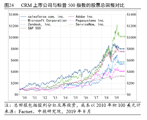 2010年至2019年9月底,不少CRM上市公司跑赢标普500指数。行业龙头Salesforce的股票总回报高达803.90%,Adobe、微软、Zendesk、PegaSystems、ServiceNow的总回报则在410.93%到1017.32%不等,都超过了同期标普500指数325.34%的总回报(见图24)。此外,如Marketo、Tableau、Magneto等CRM上市公司被私有化时股东还获得了可观的收购溢价。SAP和Oracle的同期回报不及标普500指数,更多与业务布局等公司个体因素有关。