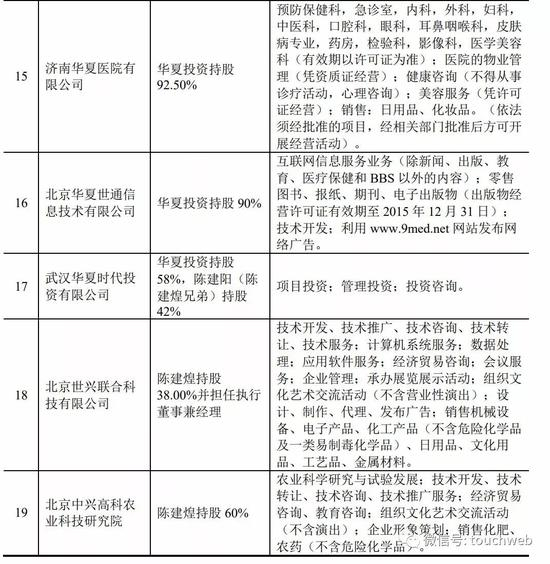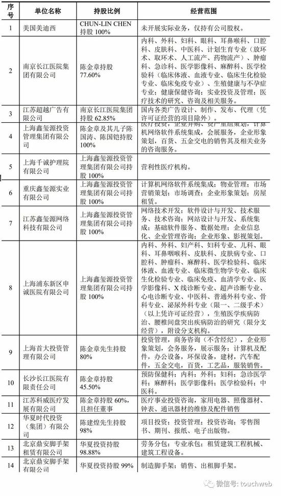 美迪西董事长陈金章还投资了:南京长江医院集团有限公司(77.6%)苏州市崎佳实业有限公司(30%)、上海鑫玺源投资管理集团有限公司(60%)、长沙长江医院有限责任公司(45.5%)等至少19家企业。