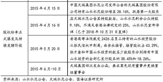 3、股权纷争爆发并且持续发酵。随着天瑞集团“悄无声息”地在二级市场上大量扫货,其所持有的山水水泥股份已于2015年4月15日增至28.16%,并跃居山水水泥第一大股东,“酝酿”已久的股权纷争在这一天正式爆发。随后2015年4月16日,山水水泥宣布因公众持股数未达要求而停牌。