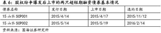 股权纷争除了使得山水水泥股票停牌无法增发股票以外,还触发了国际债券提前偿还条款,本来就已经出现了融资困难的山水水泥更是资金链紧张,再加上后续的董事会改组,在董事会新旧交替的过程中企业的经营风险也有加大。山东山水作为山水水泥的内地运营实体,其财务状况直接受到了股权纷争的影响,2015年11月12日,山东山水20亿超短融“15山水SCP001”因无法按时取得足够资金以偿付债务而宣布违约,这只债券成为了山东山水的首只违约债券。