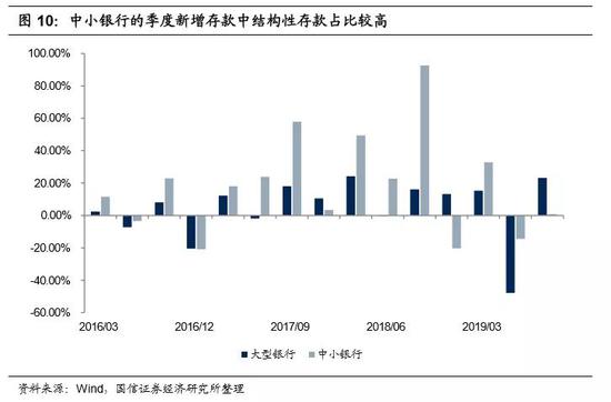 2019年10月18日,银保监会发布了《关于进一步规范商业银行 结构性存款业务的通知》,开始整治结构性存款市场。此前,市场上出售的一些结构性存款,实质上是“伪结存”,即通过嵌入一个大概率触发(或大概率不触发)的金融衍生产品(就是所谓的“结构”),或者干脆就没真正嵌入任何结构,以此实质上为客户保证了一定的收益率。部分存款基础较差的银行,以此规避了存款利率的行业自律机制上限,实现了高息揽存。从2017年开始,中小银行(央行信贷收支表定义的中小银行是除八大行之外的银行)每季新增的存款中,结构性存款(包括个人、对公)占比非常高,可见结构性存款已经是中小银行获取存款的主要方式。相比之下,客户基础良好的大型银行(即八大行)该占比就低很多。