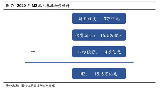 首先,我们使用的是剔除了货币市场基金的M2口径,即老M2口径,数据均来自央行。2018年末,老M2余额为179.29万亿元。假设2019年、2010年M2增速为8.2%、8.0%,那么2019年、2020年末老M2余额分别为194万亿元、210万亿元。其中,2020年的M2增量为15.5万亿元。