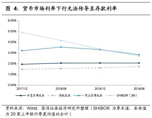 而银行的负债中,存款的占比又是最高的,存款成本是决定整体负债成本的核心因素。2019年以来的情况便是,银行间市场利率下行驱动了银行的同业负债利率下降,但由于银行间市场利率对存款利率的传导效果不佳,导致存款利率较为刚性,甚至还缓慢上行。最终,银行整体负债成本并未出现明显下行,只有部分同业负债占比较高的银行,还能观察到负债成本下行,有些存款占比较高的银行则完全体现不出负债成本下降的效果。因此,贷款定价也很难显著下行。